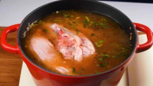 3. Add the stock, bouillon cubes, white wine, diced tomatoes, chopped basil and add the three chicken breasts. Let simmer 1 hour.