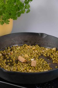 1 In a large skillet, cover the bottom with olive oil. Add 1/2 tsp of salt, 1/2 tsp pepper and 1/8 tsp red pepper. Add onion and sauté till clear in appearance. Do not drain the peas, add both cans with the liquid to the mixture. Add 2 chicken bouillon cubes and the white wine.