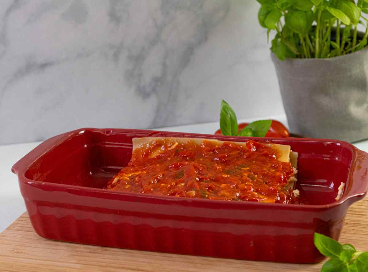 In a lasagna pan, ladle in the sauce and cover the bottom of the pan. Add the first layer of the lasagna covering the bottom of the pan.