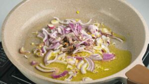 1. Cover the bottom of the skillet with olive oil and sauté the onion, add the salt, pepper, and red pepper flakes. Cook till onion is translucent.